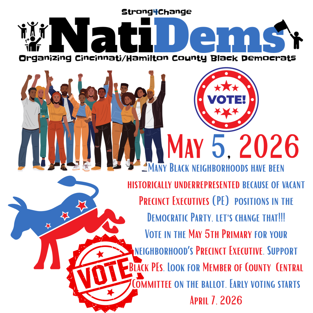 Black Cincinnatians deserve representation that reflects our community’s diversity, understands our lived experiences, and fights relentlessly for our interests. For too long, decisions affecting Black neighborhoods have been made without community-responsive Black leadership at the table. Precinct Executives are the foundation of party power—they elect party leadership, influence endorsements, and mobilize voters. When Black Democrats hold these positions in proportion to our presence in the community, we shift the entire political landscape toward justice and equity. We pursue this mission because incremental change is no longer sufficient. Our children deserve excellent schools now. Our families deserve safe, affordable housing now. Our communities deserve economic investment now. By organizing Black Democrats into positions of power and pushing the party toward bold, progressive solutions, Cincinnati Black Democrats transforms political engagement into political power, and political power into the real, lasting change our city needs.